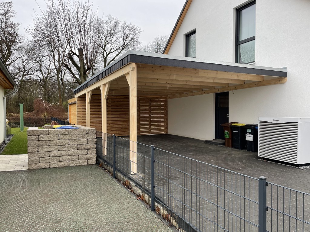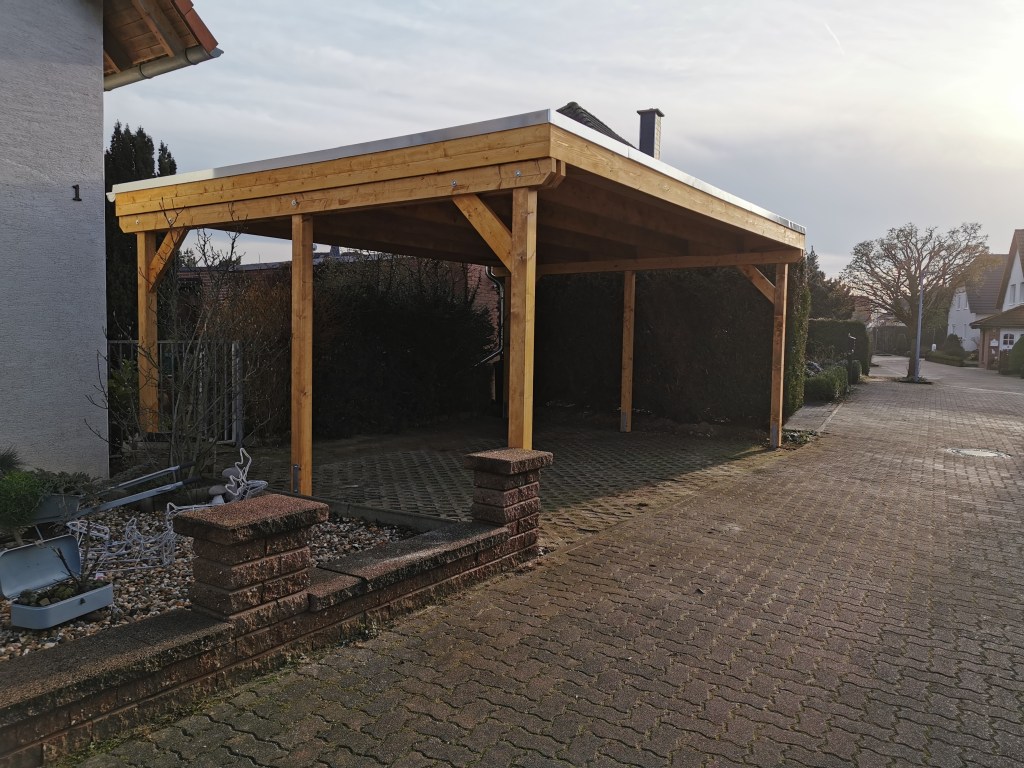 Alle Carports werden aus KVH (Konstruktionsvollholz) oder Leimholzbindern gefertigt. Das Dach kann klassisch aus Rauspundbrettern, Unterspannbahnen und Schweißbahnen bestehen. Alternativ bieten wir auch Trapez-und Pfannenprofile aus beschichteten Stahl an.