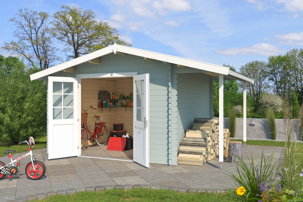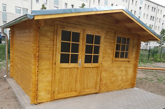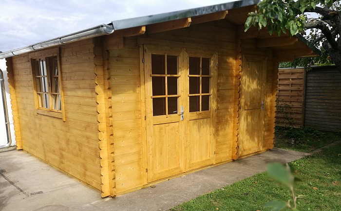 Die Gartenhäuser werden in Blockbohlenbauweise aus hochwertiger nordischer Fichte gefertigt.